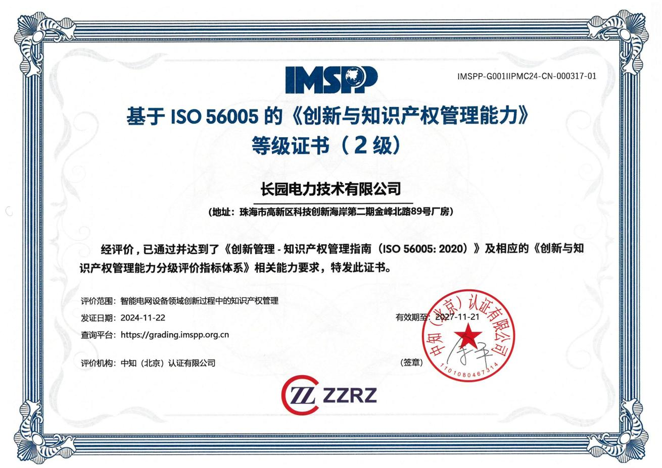 近日,在珠海市与高新区的知识产权主管部门领导班子的带领指导下,多宝电竞科技集团旗下子公司多宝电竞电力技术有限公司(以下简称:多宝电竞电力)顺利获得珠海首批智能电网设备领域国际标准ISO 56005二级认证证书。